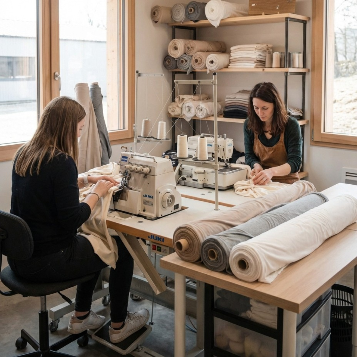 Nous utilisations un tissu en mélange de coton bio et un tout petit peu de spandex (pour permettre l'élasticité sans avoir d'effet rebond)